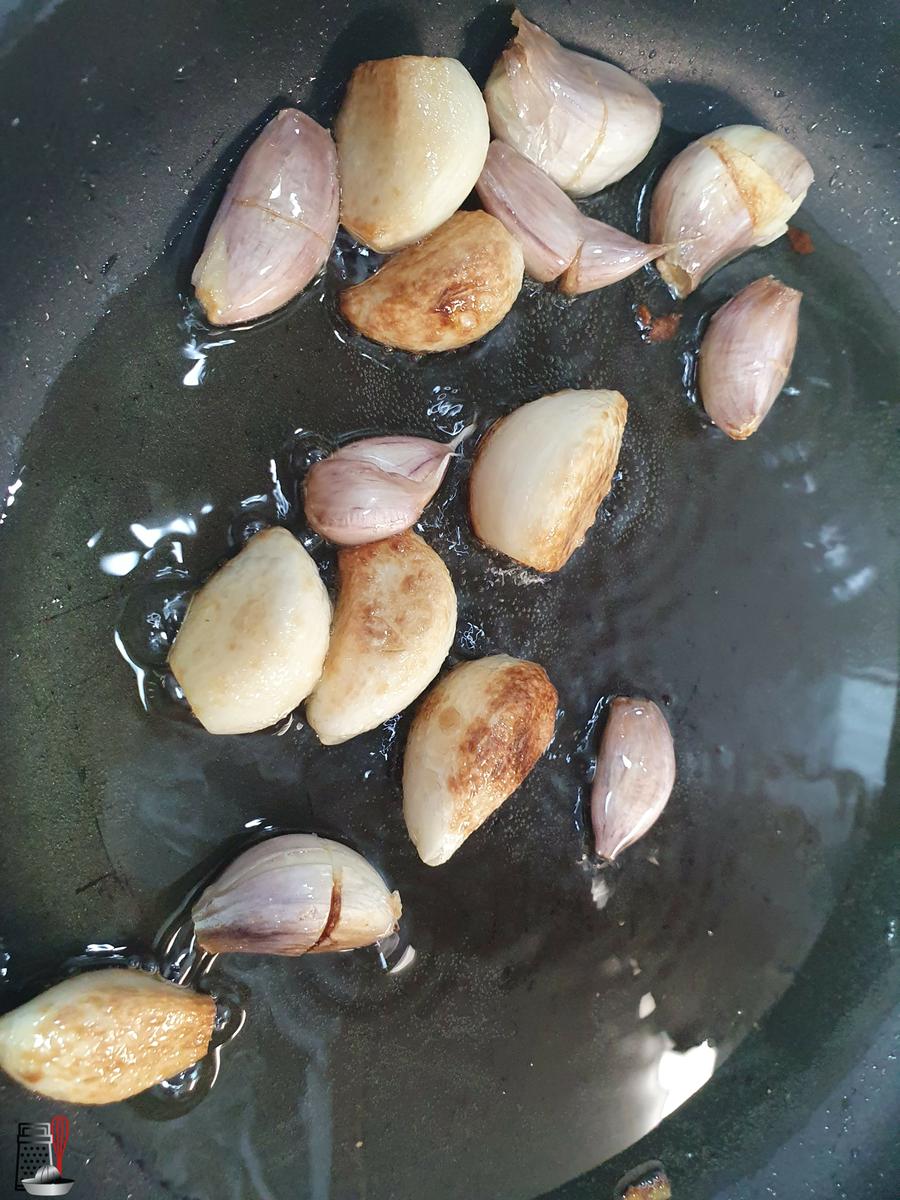 En una sartén ponemos un poco de aceite doramos los ajos. Yo puse algunos sin pelar, porque me gustan más. Los retiro.