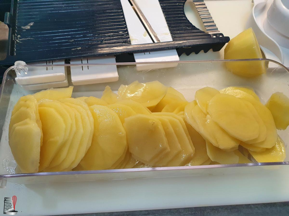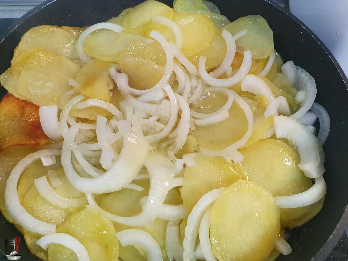 Para hacer las patatas panadera he cortado con la mandolina las patatas y en una sartén con un poco de aceite las he frito junto con la cebolla cartadas en gajos finos. Lo dejo hacer todo a fuego medio para que no se doren y se pongan crujientes. Las salo una vez terminadas.