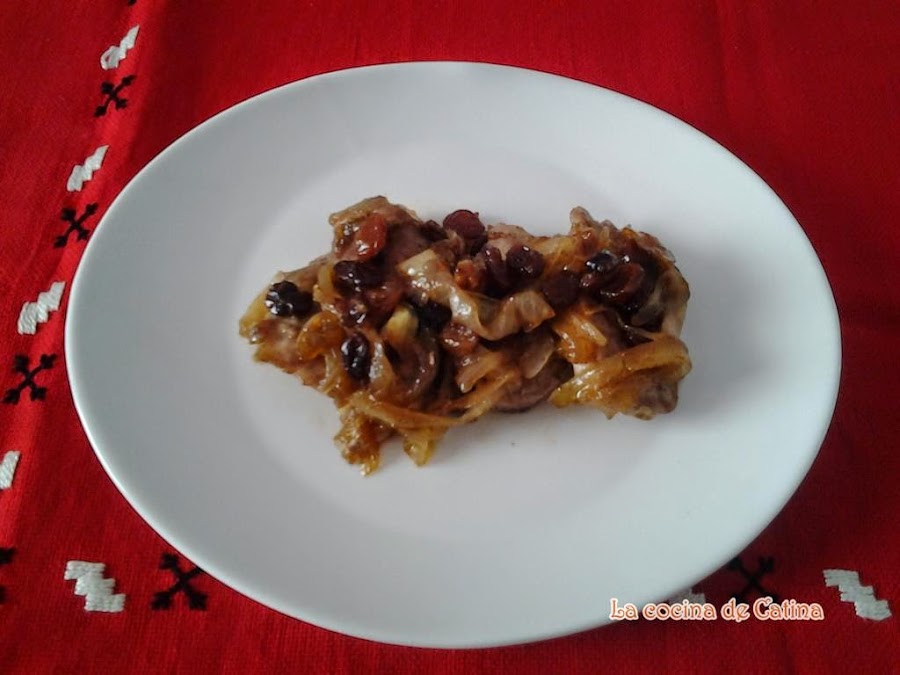 Preparación: Pelar la cebolla y cortarla en tiras finas. Calentar el aceite en una sartén y rehogar la cebolla, a fuego suave, hasta que esté transparente. Incorporar las pasas, el azúcar, la canela, el jengibre y la sal. Tapar y cocer a fuego suave hasta que tome un color dorado y ligeramente acaramelado. Apartar del fuego y reservar. Salpimentar la carne y freírla con un poco de aceite, procurando no hacerla demasiado. Servir los solomillos con la cebolla por encima.