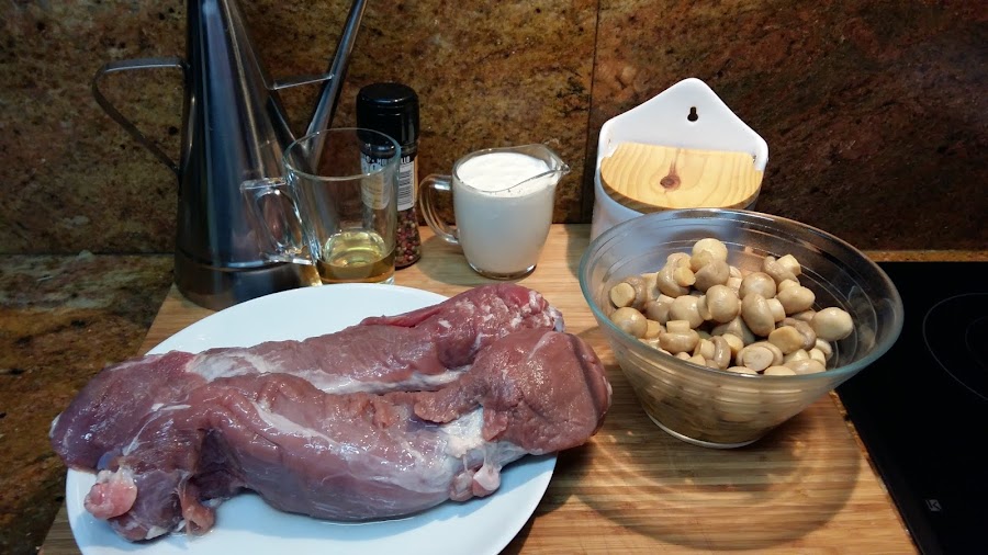 1 solomillo grandecito, 1 lata de champiñones enteros, 200 ml de nata (crema de leche) líquida, 1 chorrito de ron añejo, 1 pastilla de caldo o caldo, sal, pimientas molida y aceite de oliva.