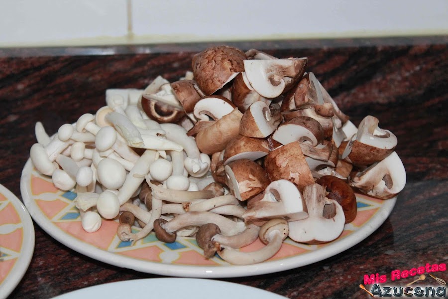 Mientras pasan los 2 minutos limpiaremos las setas con ayuda de un pincel o trapo y las picaremos en trozos medianos, si utilizas la variedad shimeji las dejaremos enteras.