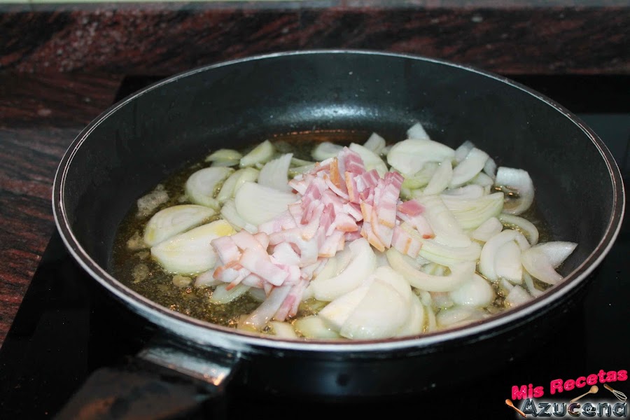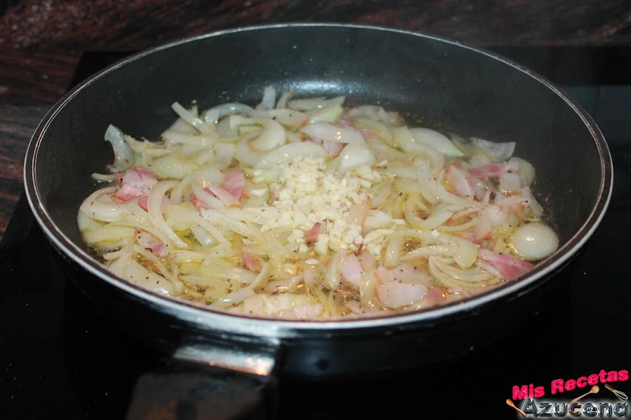 En este mismo aceite añadiremos el beicon junto con la cebolla, salpimentamos y dejamos sofreír durante 3 minutos para poder añadir el ajo, removemos todo y lo dejamos sofreír durante 2 minutos más.