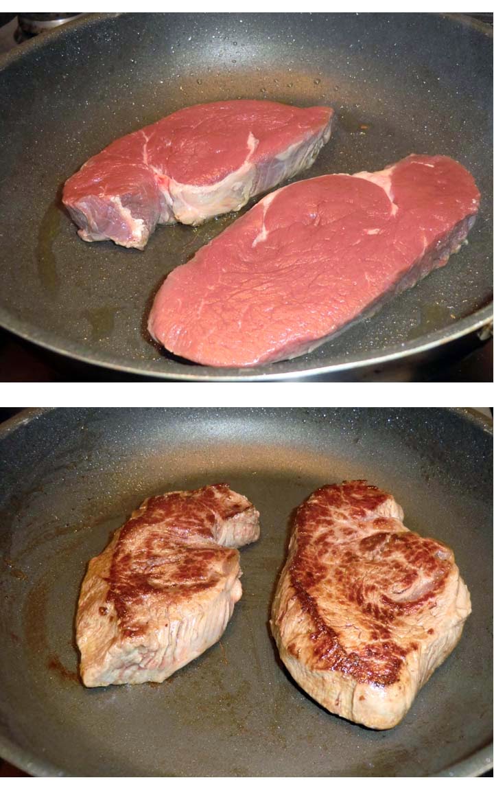 En una sartén o plancha caliente con unas pinceladas de aceite cocinamos los solomillos (que tendremos a temperatura ambiente) a fuego fuerte, para que se doren por fuera y queden al punto por dentro. Los hacemos unos minutos por cada lado, el truco para saber cuándo darle la vuelta al solomillo es ver que el lateral comienza a cambiar de color.