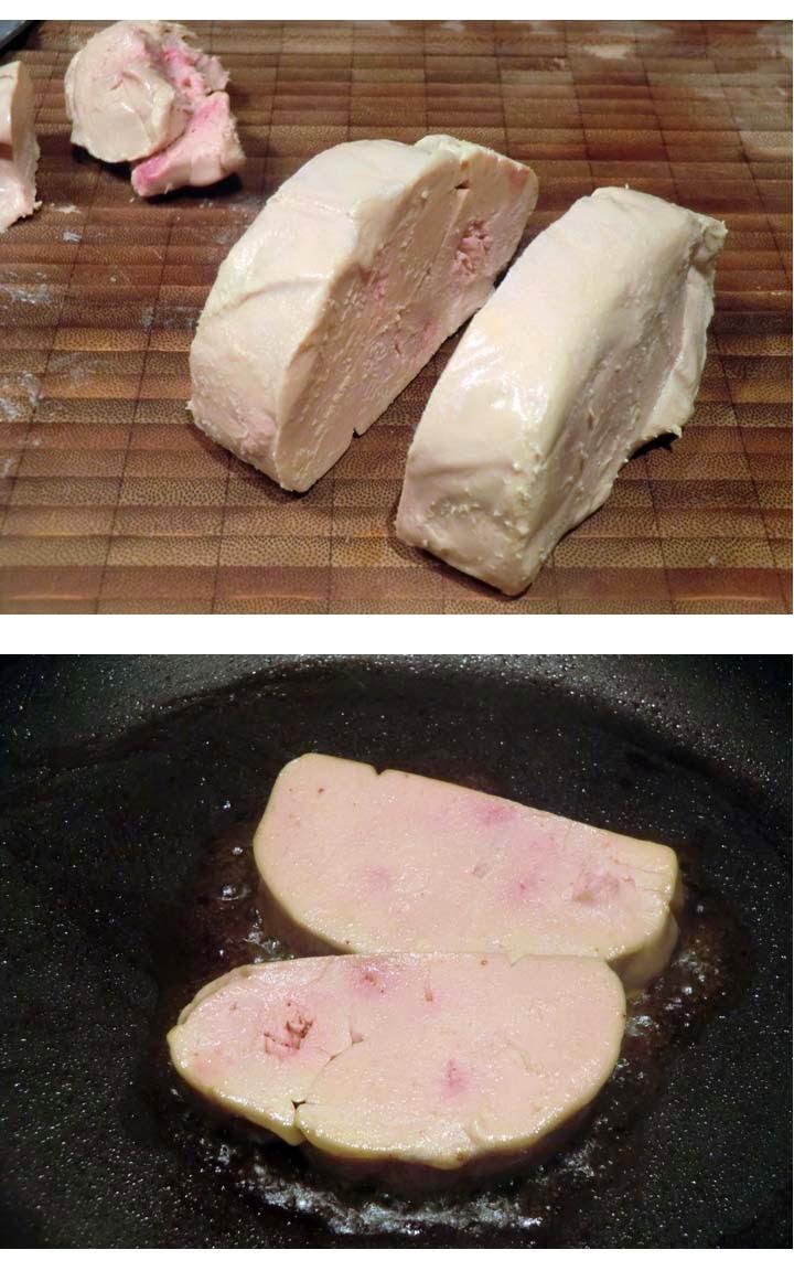 Desvenamos el foie, si es que tiene alguna vena, y en la misma sartén lo doramos sin nada de aceite, se hará con su misma grasa. Lo tenemos un minuto por cada lado, si nos descuidamos nos quedaremos sin foie porque se fundirá por completo. En cuanto lo damos la vuelta añadimos el brandy y con un mechero lo flambeamos y retiramos rápidamente en cuanto se apague la llama.
