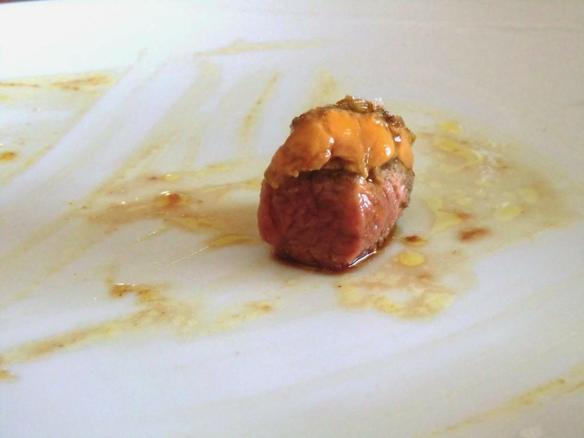 Emplatamos, primero el solomillo con unas escamas de sal, encima colocamos el foie con más escamas de sal y acompañamos con las patatas fritas y más escamas de sal.