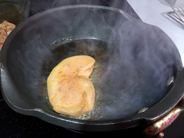 3. En una sartén a fuego muy alto marcamos la escalopa de foie, debe ser a fuego muy fuerte y en un tiempo muy corto para que no se deshaga. Lo retiramos de inmediato cuando tome el color tostado. Sobre el solomillo caliente seguirá deshaciéndose un poco.