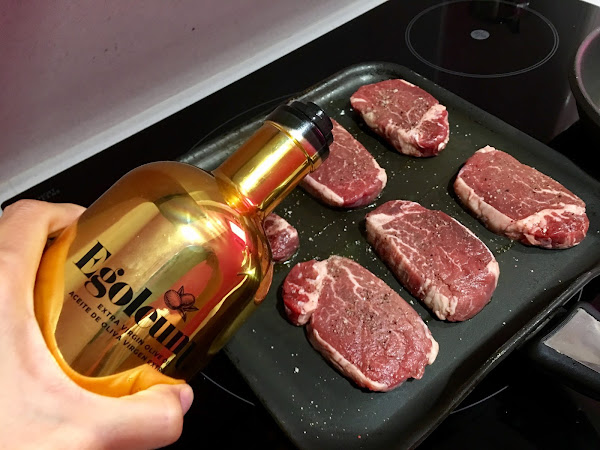 2. Calentamos una sartén, y ponemos los seis trozos de solomillo sobre ella. Salpimentamos la carne con la flor de sal picante de Soso Factory y regamos con el aceite de oliva virgen extra de e
