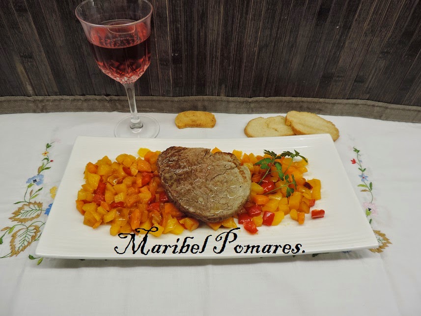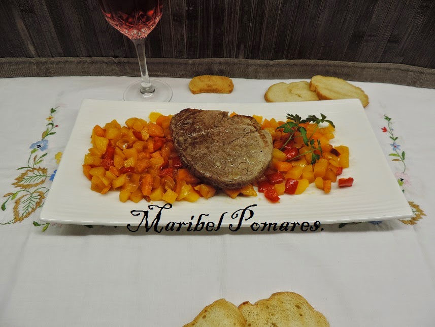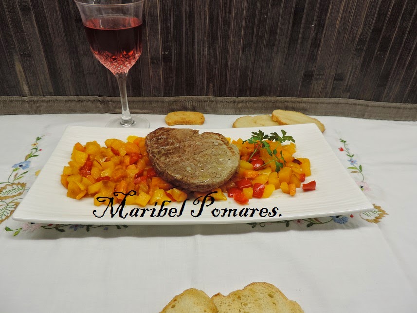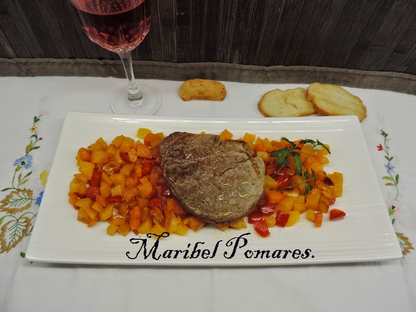 Ponemos las verduras en el fondo del plato y el solomillo encima.