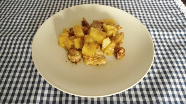 Se pone en el fuego una sartén con un poco de aceite, se añade los trozoz de carne y se doran por los dos lados, se reseva, echar un poco de aceite e incorporar la cebolla hasta que se dore, se agregan los trozos de piña (la piña se pela y se retira la parte central, cortar en rodajas y despues en trozitos) se morea 5 minutos mas , se vierte la miel, el vino y el tomillo, se cuece hasta que se quede en una salsa y se sirve caliente.