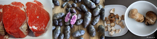 Esta temporada el maceto-huerto de la terraza ha dado una pequeña cosecha de patatas violetas y las hemos utilizado en el rosti, más proximidad imposible. Los boletus son de la última salida al bosque en busca de setas. Y, antes de que lo preguntéis, la carne la seguimos comprando en el mercado :)