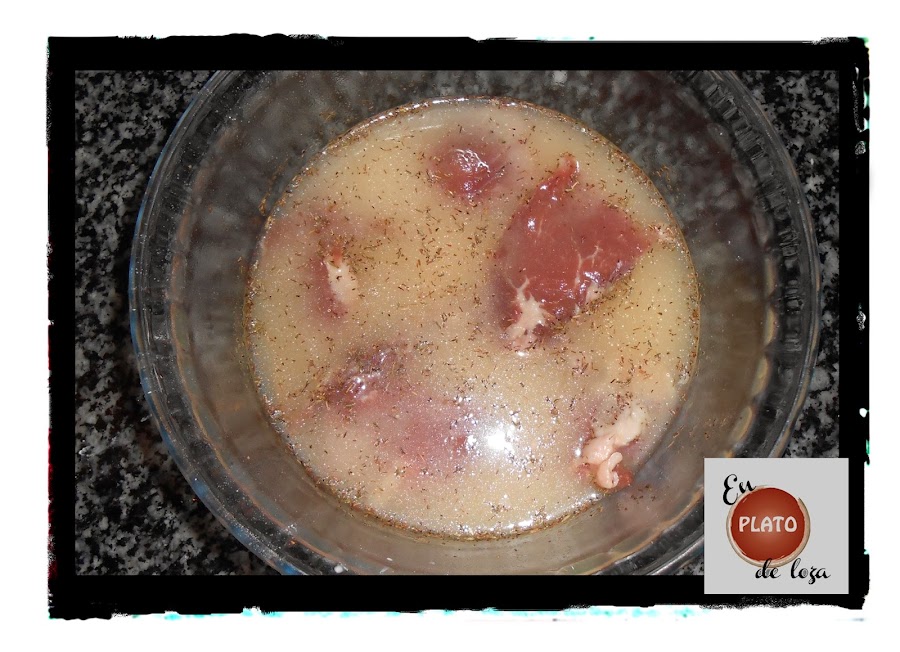 El solomillo lo cortamos en medallones y los ponemos a macerar en un bol con el caldo de ave, el tomillo, la maicena y la levadura. Deben estar macerando durante al menos una hora, dándoles la vuelta cuando lleven 30 minutos.