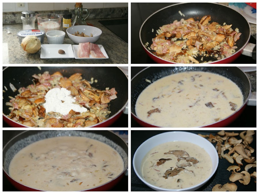 Colocar los boletus deshidratados en un bol con los 100 ml de agua para rehidratarlos. Aprovechamos a preparar los demás ingredientes para la salsa. Corta el bacon en trozos pequeños, y pica la cebolla. En una sartén con aceite de oliva, pochar la cebolla, sin que se dore. Añadir la panceta y dejar que se haga un poco hasta que empiece a cambiar de color.º En este punto, se le añaden los boletus escurridos y se deja unos minutos. Añadir una cucharada de harina y dejar que se tueste . Cuando veas que la harina ya empieza a burbujear, incorpora el agua del remojo de los boletus pasada por un colador removiendo bien con la espátula o una varilla manual. Condimenta con un poco de nuez moscada al gusto, sal y un poco de pimienta negra molida. Añadir la leche, sin dejar de remover. La cantidad de leche es a tu gusto. En esta receta se han empleado las cantidades que te indico arriba en los ingredientes. Cuando hierva, añade el queso crema y cuando se haya integrado por completo, la salsa está ya preparada. Verás que queda muy cremosa y con un olor irresistible. Puedes servirla triturada en la batidora o sin triturar, todo depende de si te gusta encontrarte tropezones. A mí me encanta con los trocitos de boletus enteros.