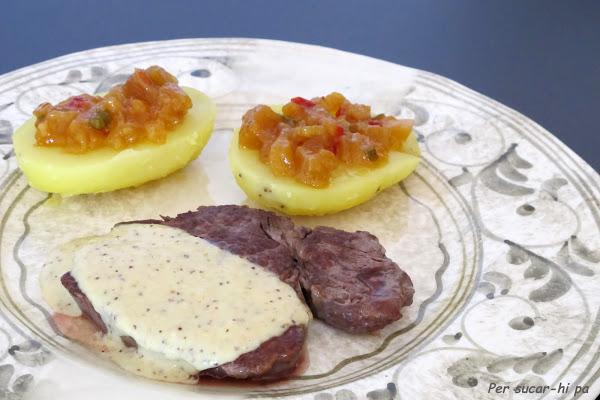 Aquí hemos elegido acompañar la carne con unas patatas asadas y dos propuestas para aliñarlas, la de la foto inicial con chutney de cebolla, o esta del final con chutney de mango.