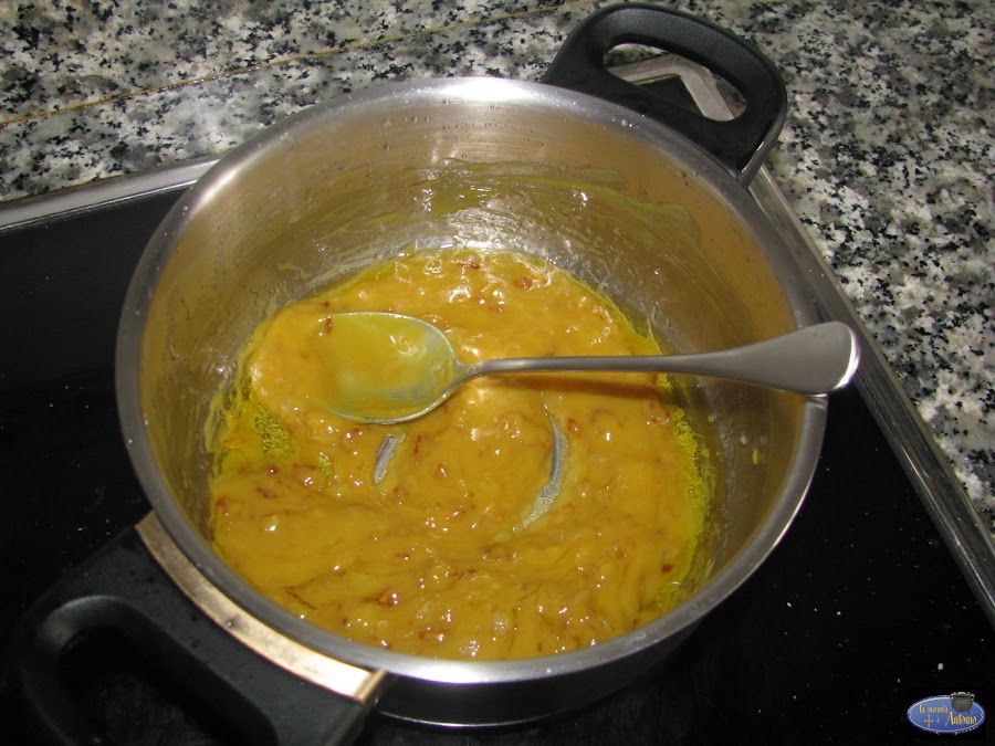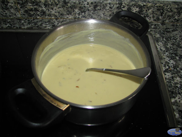 Cuando la cebolla esté pochada le añadimos un par de cucharadas grandes de Mostaza a la miel de Maille,le damos un hervor y añadimos la nata (crema de leche) líquida.Dejamos reducir un minuto y reservamos.