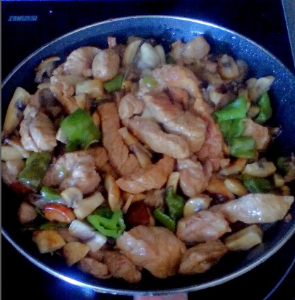 En una sartén calentamos aceite de oliva y vamos a ir agregando según el orden de cocción de los alimentos. Primero los pimientos, luego los champiñones, Después las teas y por último la carne.