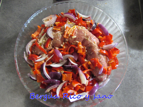 4. Y ya solo queda hornear hasta que la carne esté cocinada por dentro. Empezamos a 200º en el horno precalentado. Recomiendo cubrir la fuente con papel de hornear para que no se queme la superficie. Le damos unos 10-15 minutos para que la verdura se ponga a tono.