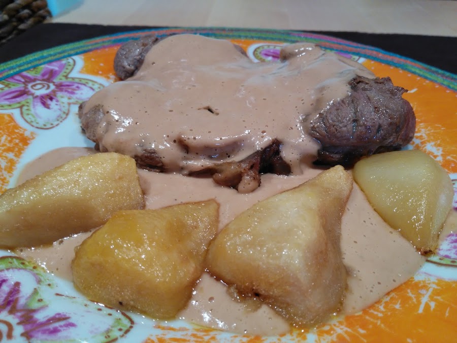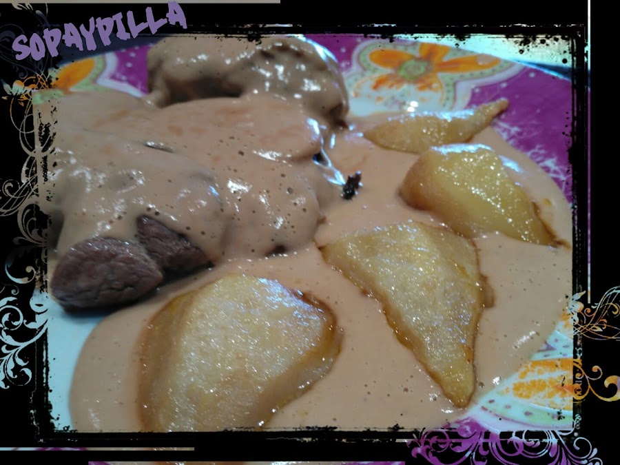 No todo va a ser pollo en esta vida...una receta superfácil y de las que quedas como una reina, se puede hacer con otro tipo de carne, pero vigilad que sea muy tierna y no tenga casi nervios ni grasa, las peras le van como las uvas al queso...de fábula!