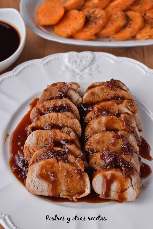 Vertemos la mezcla del glaseado sobre el solomillo y lo colocamos en una fuente de horno. Asamos durante 15 minutos a 200ºC, dándole la vuelta a mitad de la cocción.