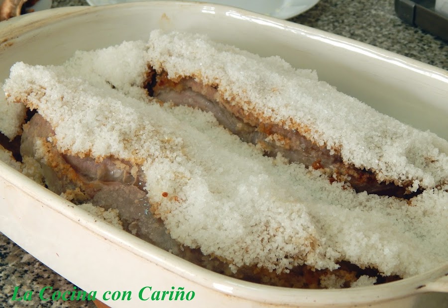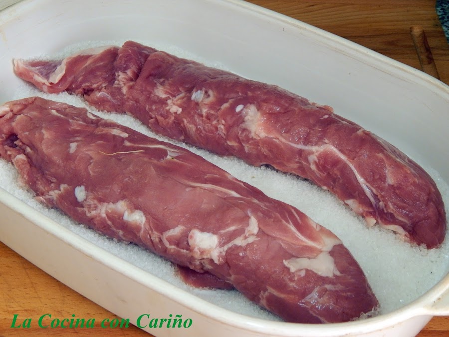 Ponemos el horno a 220 ºC por arriba y por abajo, con ventilador. Mientras calienta, en una fuente colocamos una cama de sal, encima aplicamos los solomillos y cubrimos con el resto de la sal, marcando los cuerpos de estos.