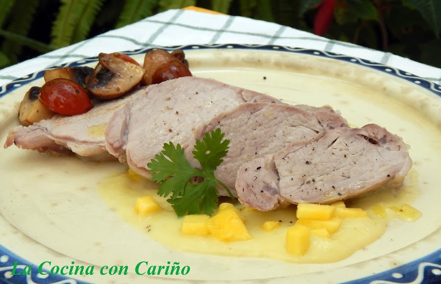 Para emplatar, ponemos un fondo de salsa de mango, que aportará un puntos de acidez y dulzor al unísono y una textura delicada y suave al plato. Encima tiramos con desprecio, el otro medio mango cortado en dadito, o brunoise, como dicen los Franceses, que aportará el resalte del sabor del mango y la textura crujiente en boca y encima las rodajas de un dedo de gruesas de solomillo de cerdo con un hilo de aceite de oliva virgen extra por encima y pimienta negra recién molida. Acompañamos con los champiñones y los Sherrys, y pedazo de plato.