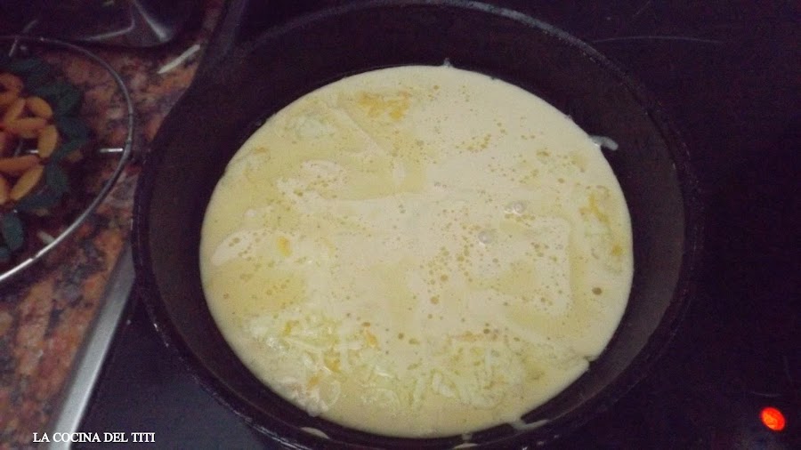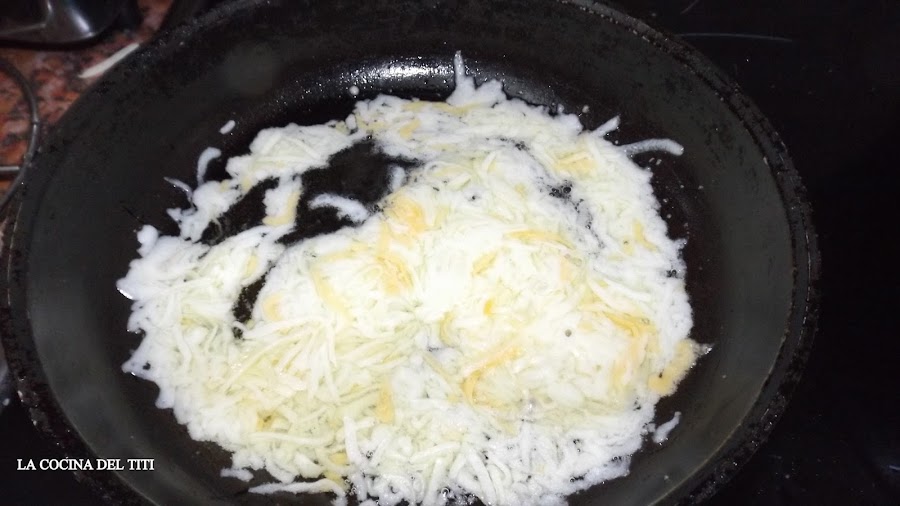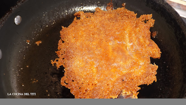 4º Para el plato decoraremos con unas hojas de albahaca y haremos una torta en una sarten con un poco de queso del mismo que hemos utilizado