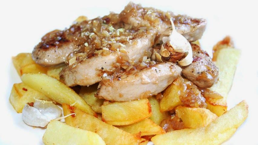 Unas buenas patatas fritas son el acompañamiento ideal de esta jugosa carne al güisqui aunque puedes usar arroz blanco o un buen puré de patatas u otras verduras.