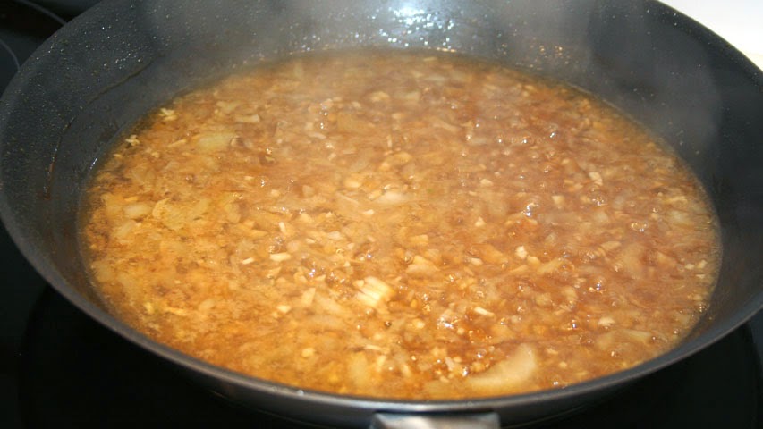 En la misma sartén sofrío la media cebolla y los ajos bien picadillos. Añado el güisqui (dejando evaporar el alcohol), agua y el zumo de medio limón.