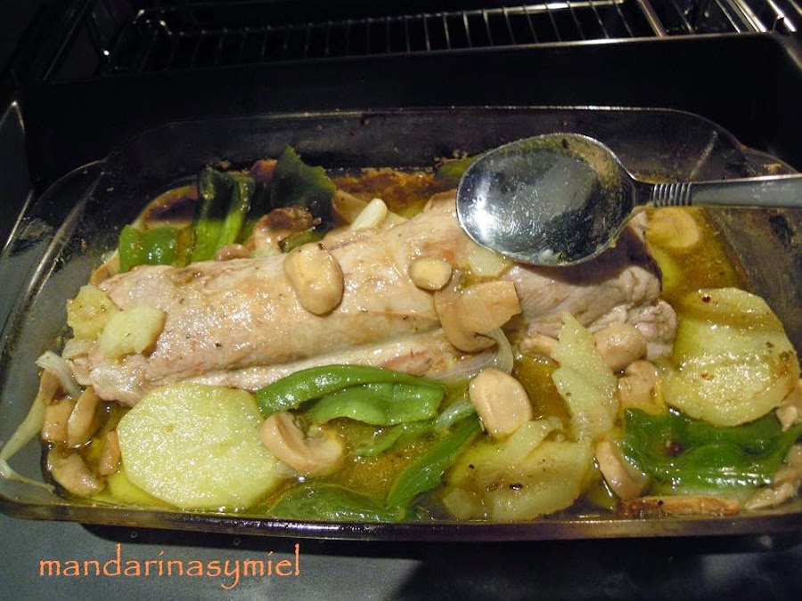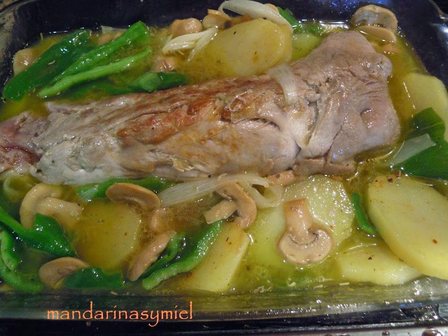 Coloca el solomillo en el centro de la fuente, riega con el vino, dale unas vueltas y mete la fuente en el horno precalentado a 200º unos 20 o 25 minutos, no te pases de tiempo porque se puede secar.