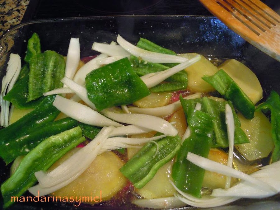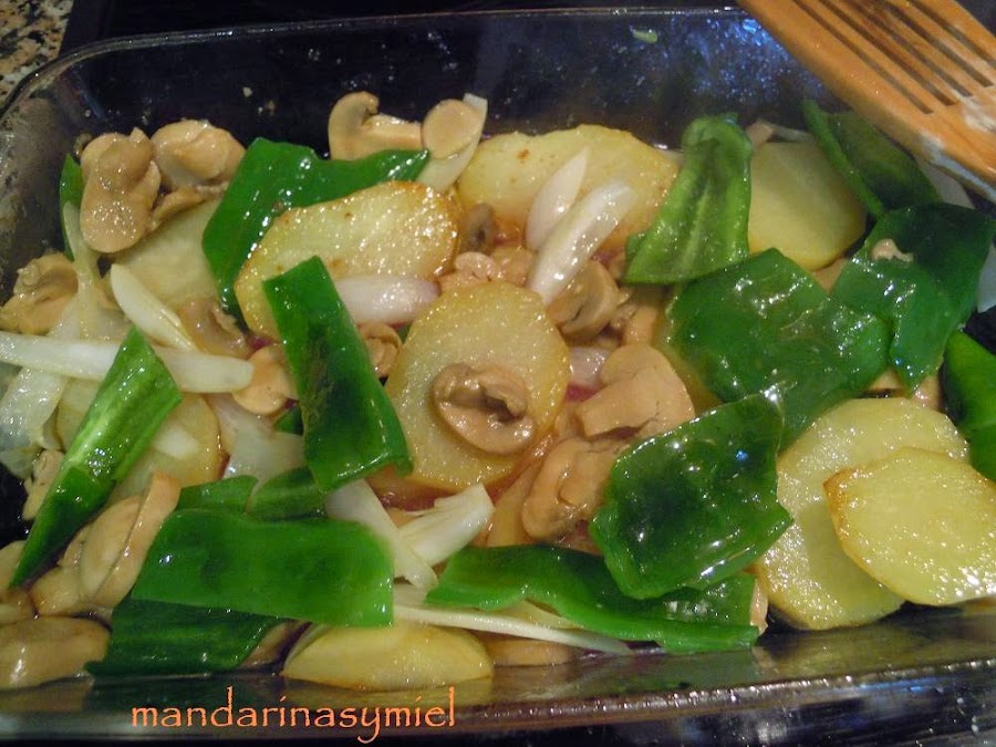 En la misma fuente que has sofrito el solomillo, pon las patatas, luego el pimiento, la cebolla y los champiñones, da unas vueltas hasta que estén medio hechas todas las verduras.