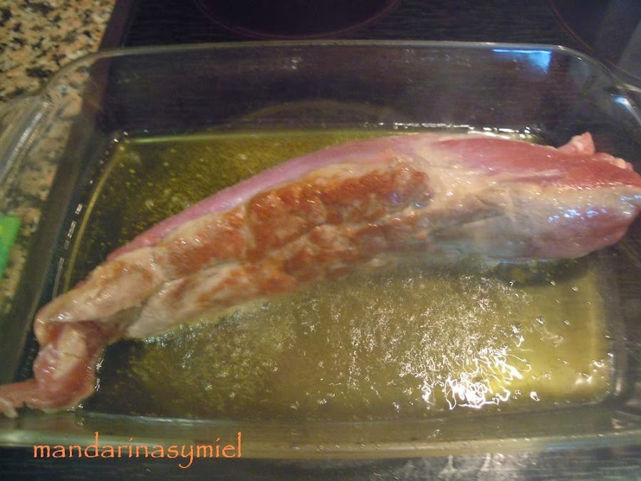 Pon una fuente de horno al fuego con el aceite, cuando esté bien caliente sofríe el solomillo, dale unas vueltas hasta que selle la carne. Saca y reserva.