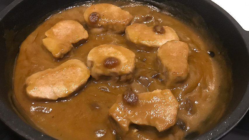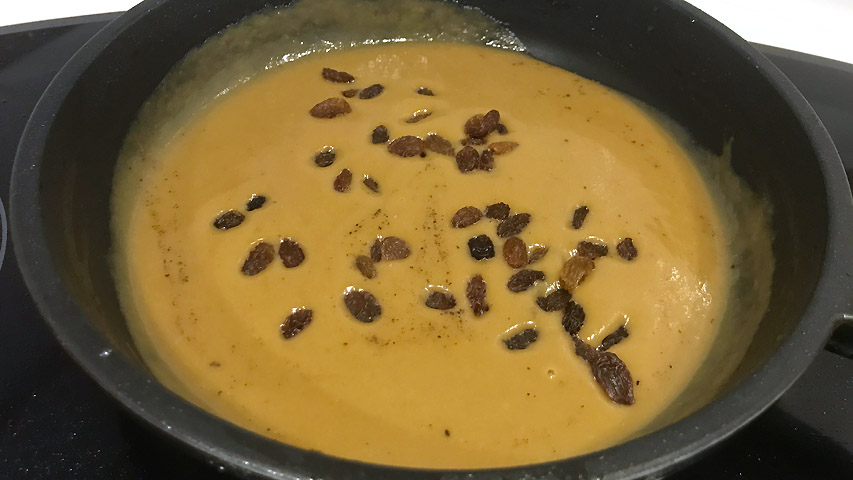 Pon la salsa resultante de nuevo en la sartén. Añade una nuez de mantequilla (opcional) y deja que se derrita. Incorpora las pasas.