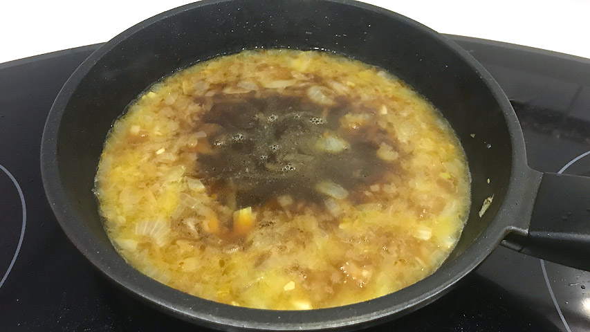 Una vez dorada la cebolla se añade el caldo y el vino y dejamos reducir más o menos a la mitad.