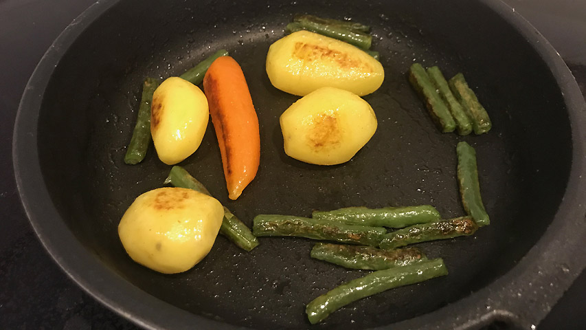 Prepara la guarnición. En esta ocasión yo he preparado unas patatitas mini que he pelado, una zanahoria que también he pelado y una habichuelitas verdes redondas (aquí las llamamos “francesas”) que he limpiado y cortado. Cuezo toda la verdura junta en un caso a fuego medio-alto con agua hirviendo con sal durante 20 minutos. Una vez cocidas las termino de hacer en una sartén con un poquito de aceite de oliva o de mantequilla para que se doren un poquito.