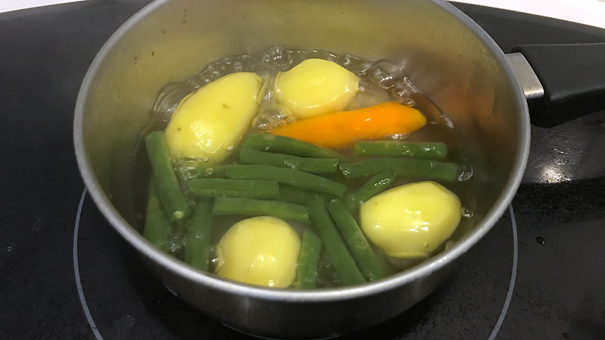 Para guarnición cuezo unas patatas, una zanahoria y unas habichuelas verdes "francesas" en agua con sal, a fuego medio, unos 20 minutos.