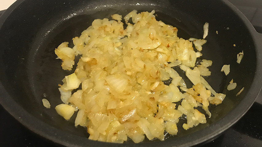 En la misma sartén y usando un poco más de aceite si fuera necesario dora la cebolla y el ajo a fuego medio.