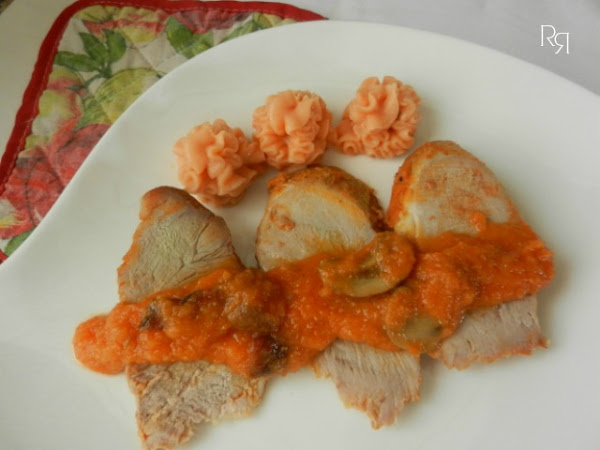 Cortamos el solomillo en rodajas y las colocamos en los platos, napamos la salsa por encima y decoramos con el puré al pimentón.