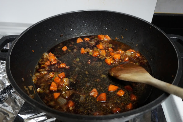 Volvemos a ponerlo al fuego, ponemos el vino tinto.