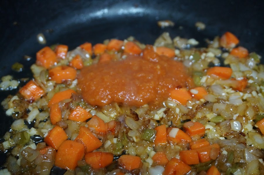Cuando ya veamos que están, ponemos el tomate frito, removemos.