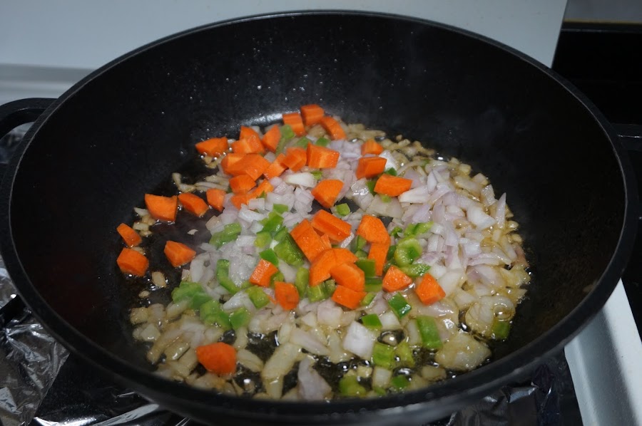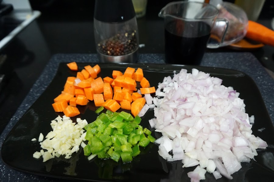 Picamos todas las verduras, las zanahorias, la cebolla, el pimiento, los ajos.