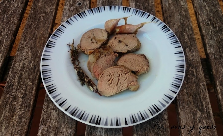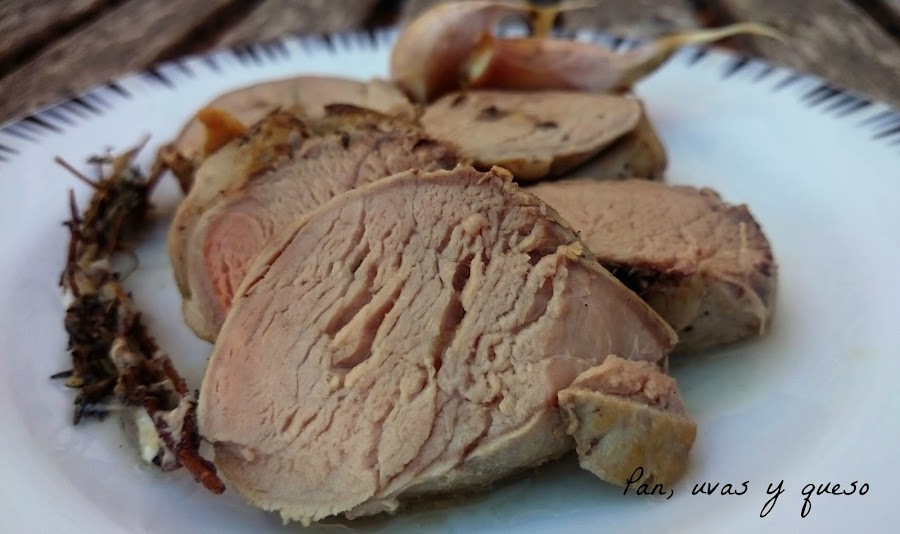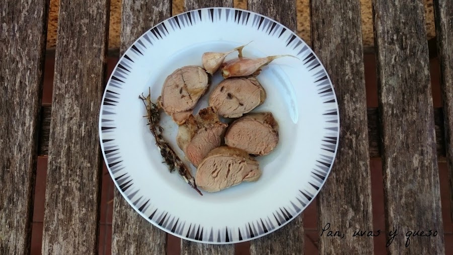 Echamos la salsa sobre la carne y cocinamos durante 2 horas, aproximadamente, en temperatura baja. Como es una carne que se hace enseguida es conveniente controlar la temperatura para que no se pase. Para mi gusto, lo ideal es que el centro de la pieza alcance los 65ºC, pero si os gusta más hecha puede llegar hasta los 70ºC.