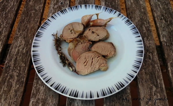 Salamoslos solomillos. En una cazuela calentamos aceite de oliva y sellamosla carne a fuego medio. Una vez sellada bajamos el fuego y añadimos los dientes de ajo enteros, el tomillo y el vinoblanco y lo dejamos hervir unos minutos. Añadimos el aguay dejamos que de un hervor.