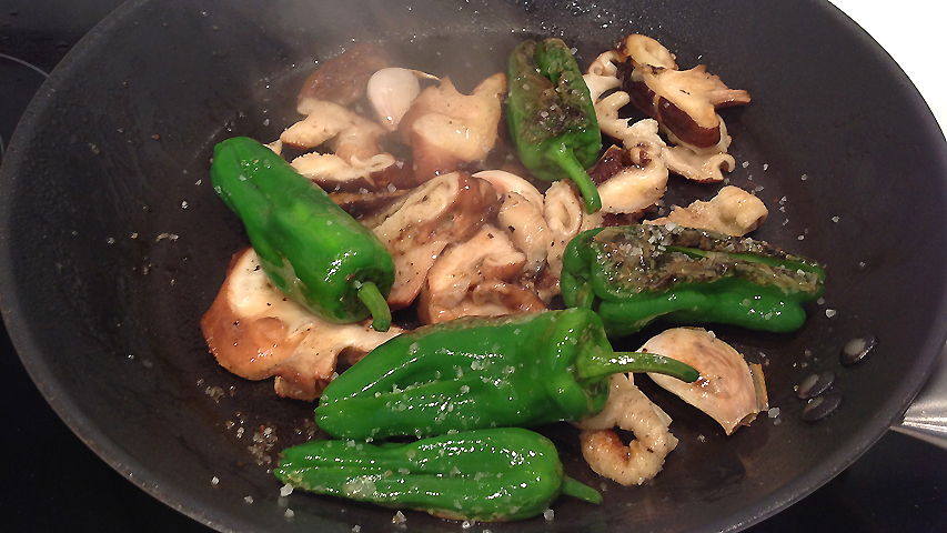 En una sartén con un poco de aceite de oliva se saltean pimientos, setas y ajos.