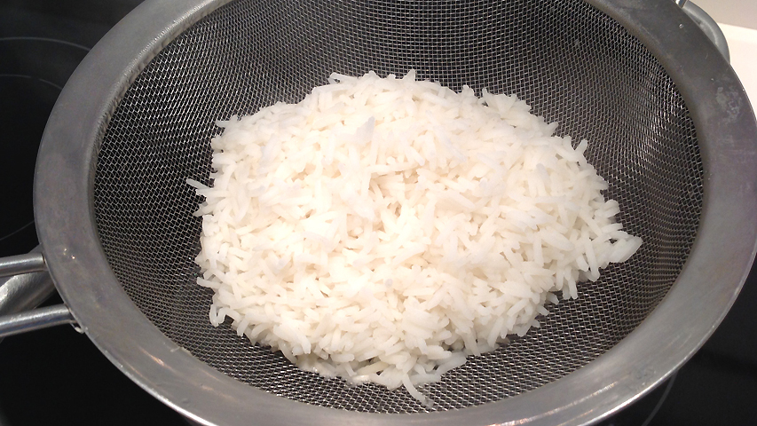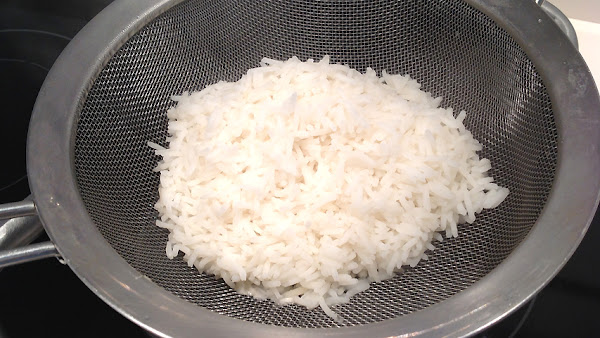 El arroz basmati se cuece en 10 minutos en abundante agua hirviendo sazonada. Después se escurre y se deja caliente sobre el colador con el agua caliente debajo.