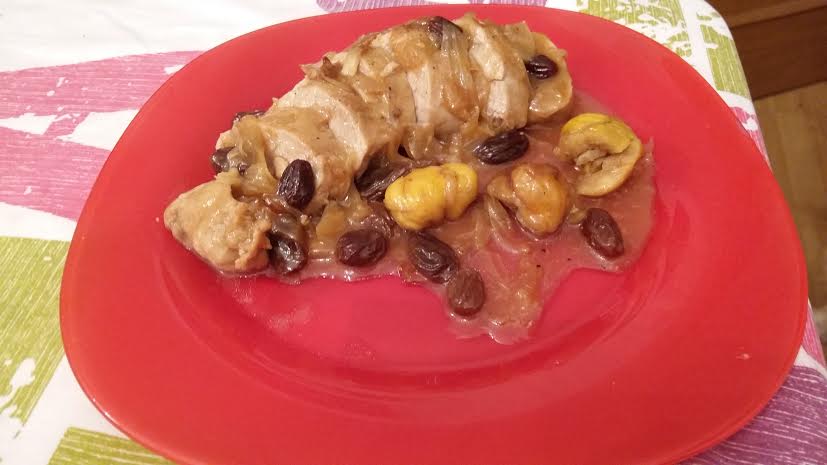 Echar los solomillos dorados, las pasas y cocinar a fuego medio bajo durante 30 minutos, removiendo de vez en cuando hasta que espese la salsa. En los 5 últimos minutos agregar las castañas peladas.