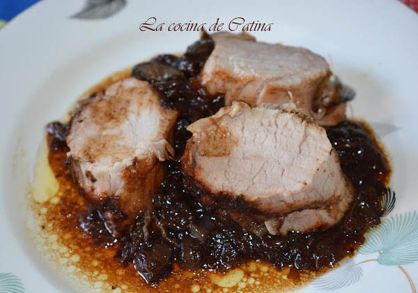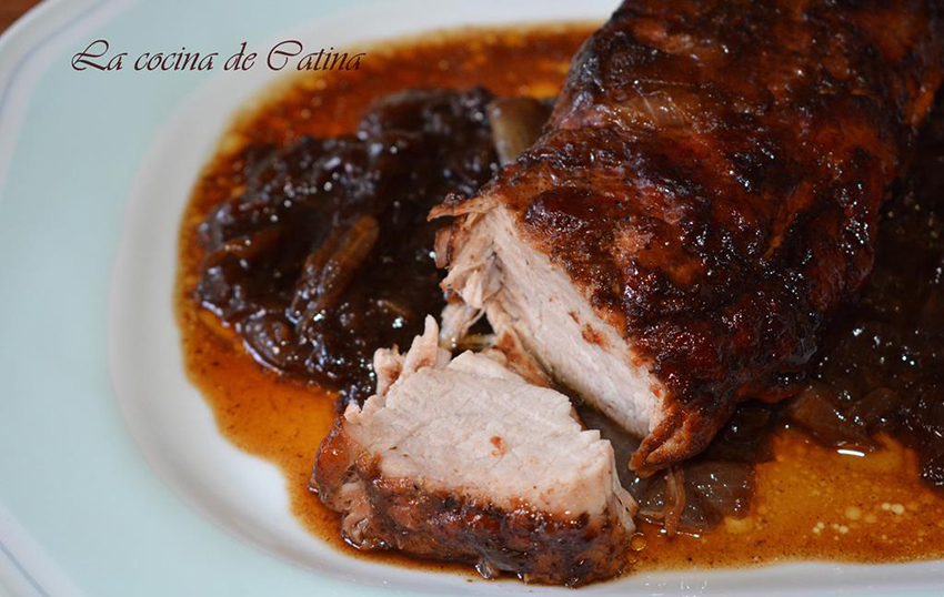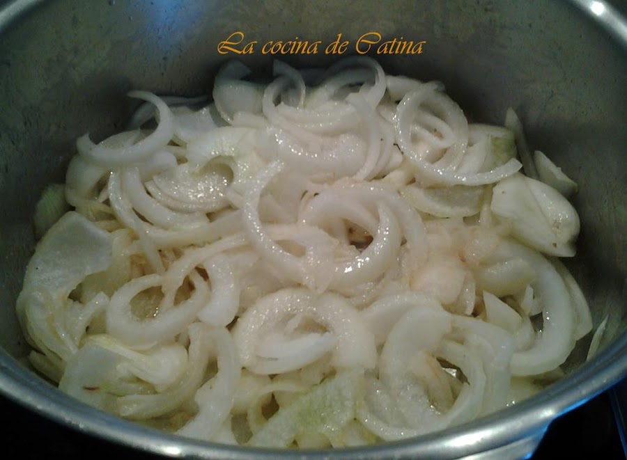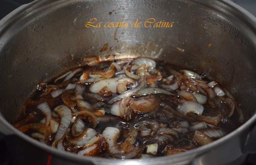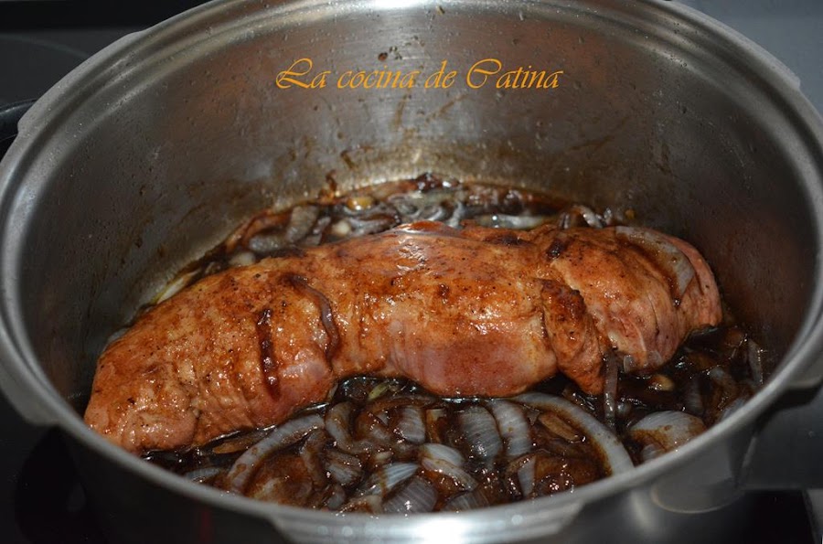 En el mismo aceite freímos las cebollas cortadas en aros, cuando la veamos doradita le añadimos el vinagre y el azúcar moreno, le damos unas vueltas y pasamos a la olla rápida con los solomillos, durante 15 minutos.