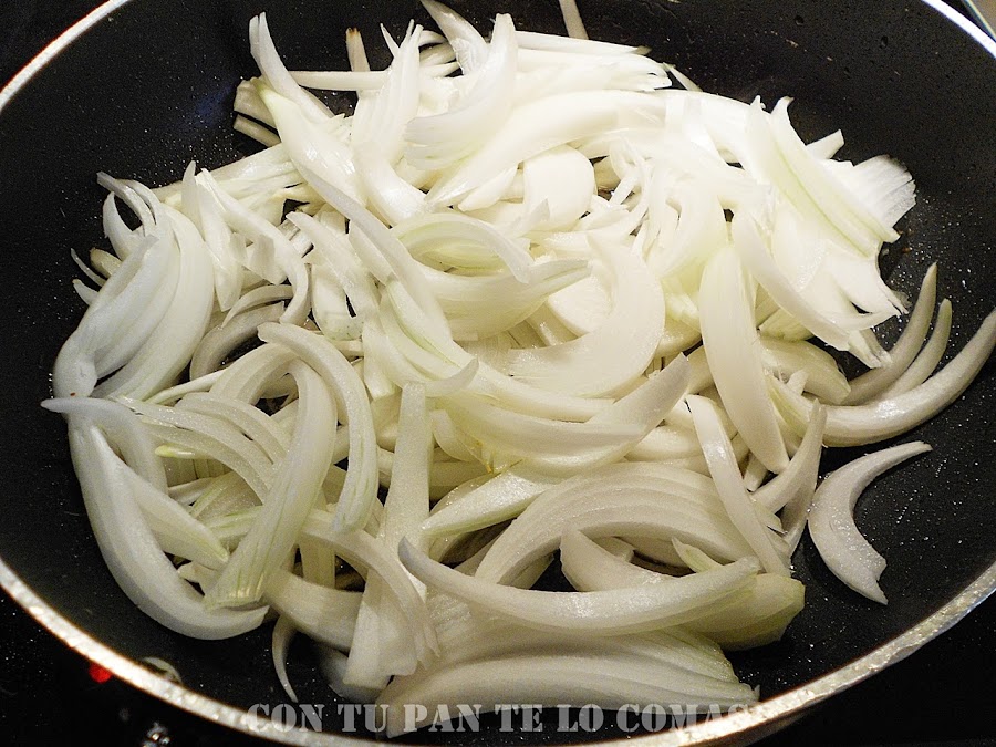 2. En el mismo aceite pochar la cebolla cortada en pluma, sazonar con un poquito de sal y dejar hacer hasta que tenga un colorcillo tostado y esté blandita. Esto es lo que más tiempo te va a llevar pero en unos quince minutos estará lista.