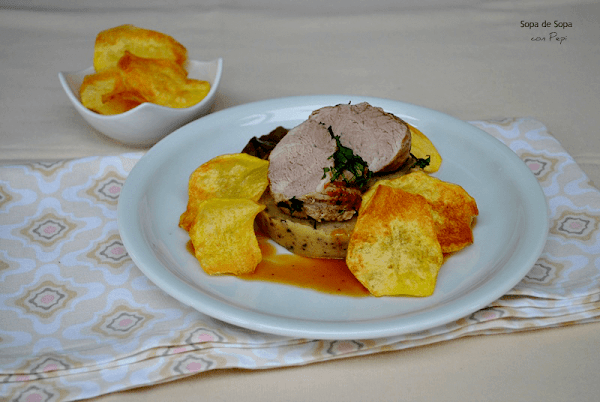 Este solomillo lo vamos a acompañar con patatas en dos texturas, en chips y en puré, siendo éste un puré especial, ya que le mezclaremos alubias blancas y aceitunas negras picadas. ¿ Te atreves a probar la receta?