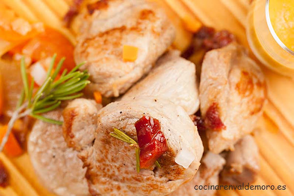Ya esta listo. Separamos unos trozos de las hortalizas para adornar junto con unos taquitos del jamón sofritos. El resto del jamón y las hortalizas los batimos, hasta conseguir una salsa fina, estupenda para acompañar esta carne. ¡Que aproveche!.