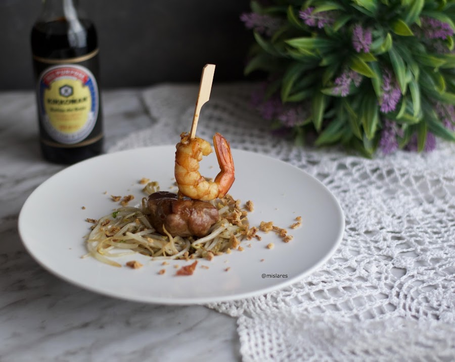 5. Montamos la brocheta poniendo en la base los brotes de soja, el solomillo con el langostino. Espolvoreamos con la cebolla crujiente y napamos con la salsa de soja de hacer el solomillo y los langostinos.