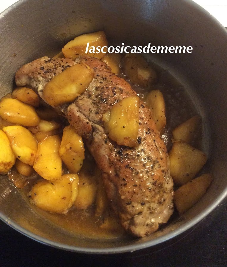 Dedicamos cinco minutos a preparar la salsa, si está muy clara podemos añadir un poco de maicena diluida en un poquito de caldo frío, dejar dar un hervor a la salsa hasta que esté en su punto, con un poco de textura, volvemos a poner los solomillos y las manzanas rehogamos cinco minutos, reservar hasta la hora de servir...
